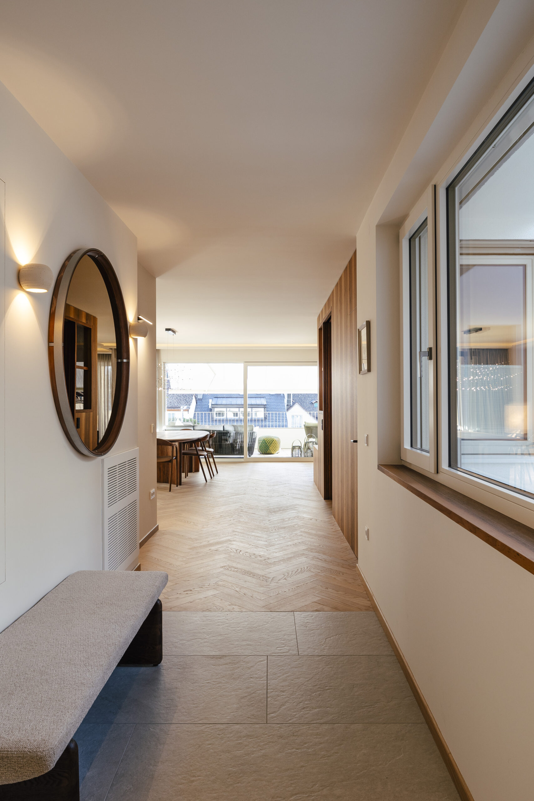 In questo appartamento l’attenzione è rivolta all’incontro tra architettura moderna e qualità artigianale tradizionale. È stato posato un pavimento in rovere, spazzolato, verniciato e senza nodi – con posa a spina di pesce. Le dimensioni accuratamente scelte delle doghe conferiscono al pavimento una struttura fine e ritmica. Nel corridoio, le piastrelle sono state posate sfalsate, mentre nei bagni la posa è avvenuta in linea, per ottenere un effetto spaziale chiaro e rilassante. L’adattamento preciso a porte e arredi fissi riflette la massima precisione esecutiva e un’attenta cura artigianale.