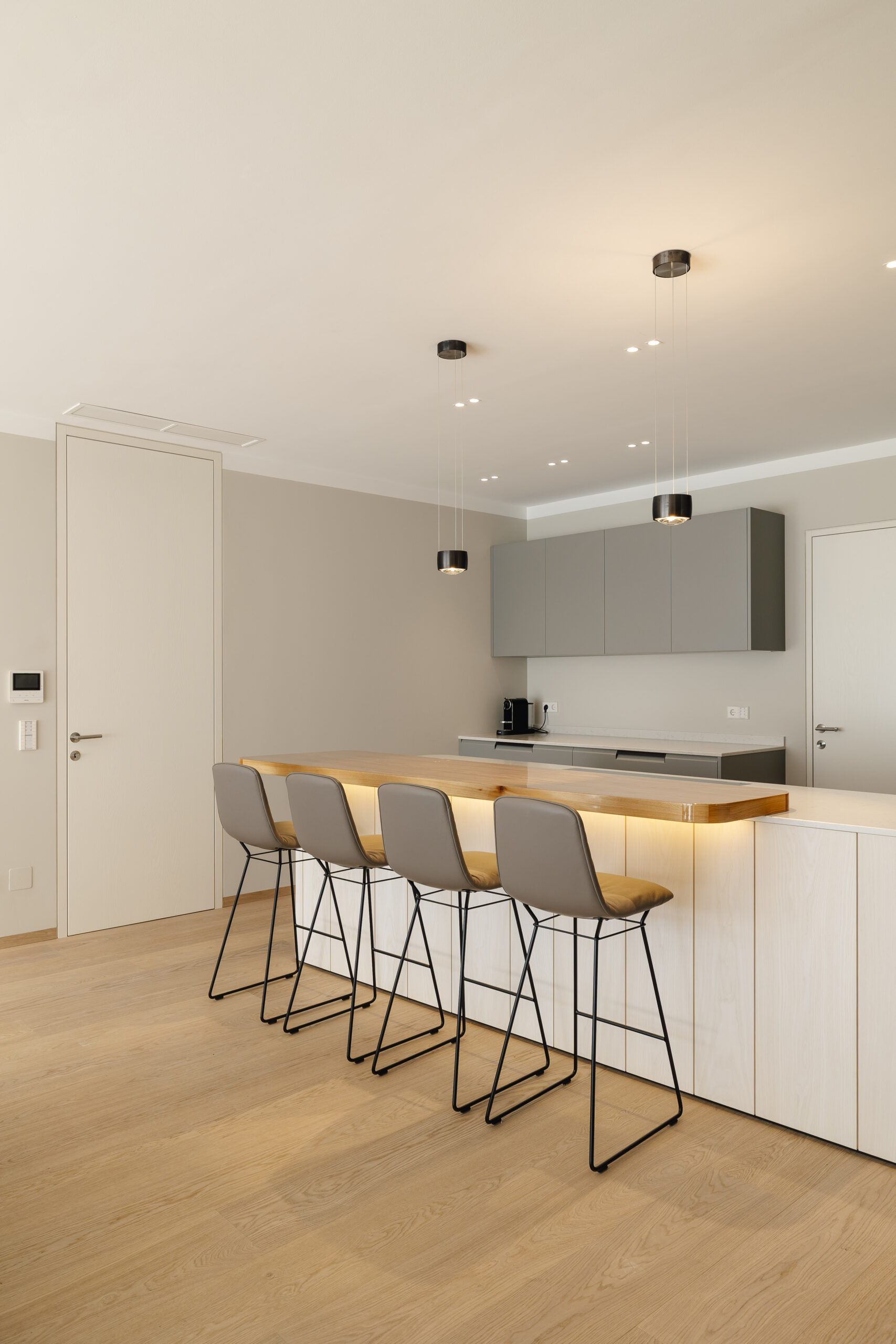 Rovere oliato in tonalità calde e piastrelle in gres porcellanato di alta qualità con effetto pietra – leggerezza mediterranea ed eleganza senza tempo.