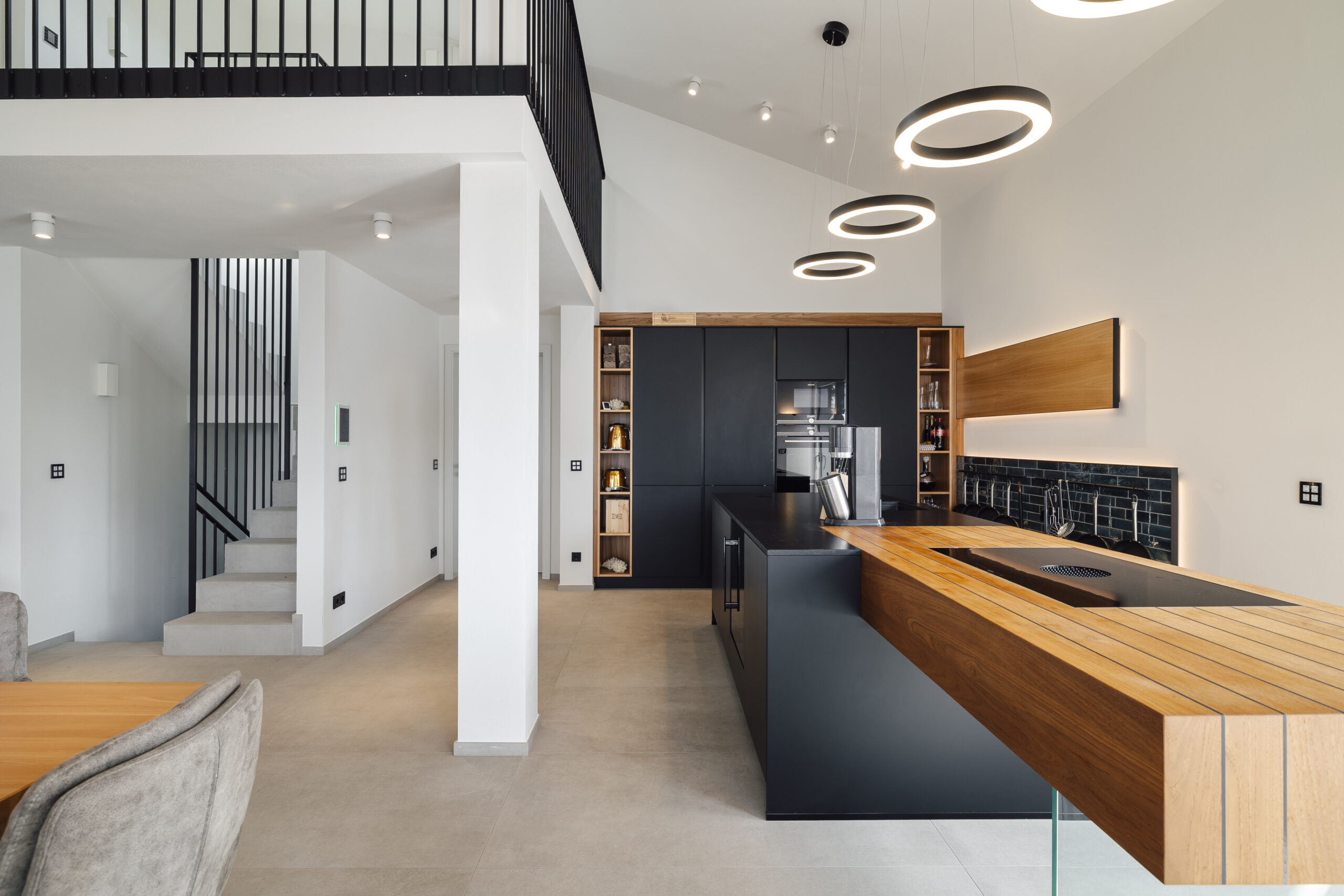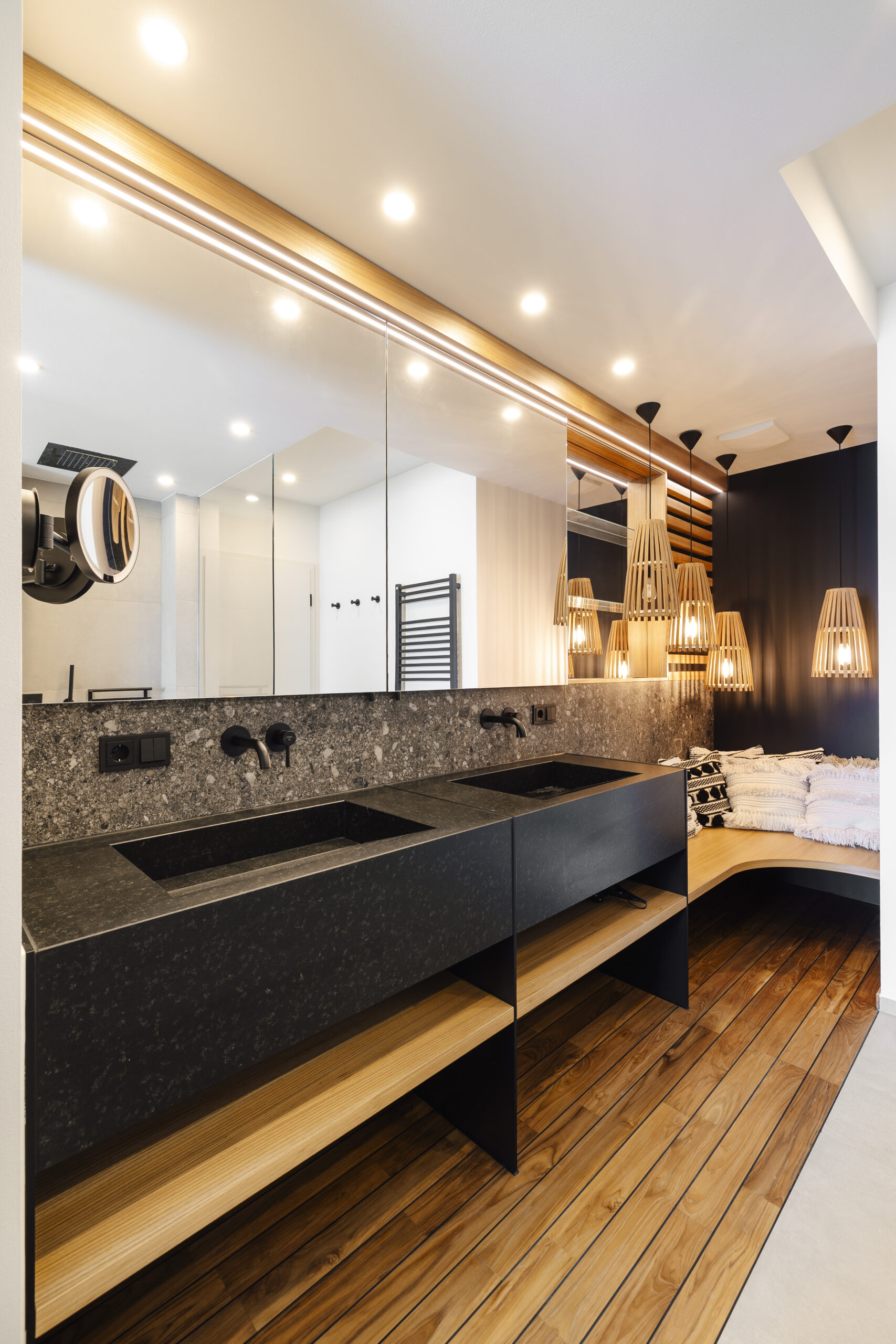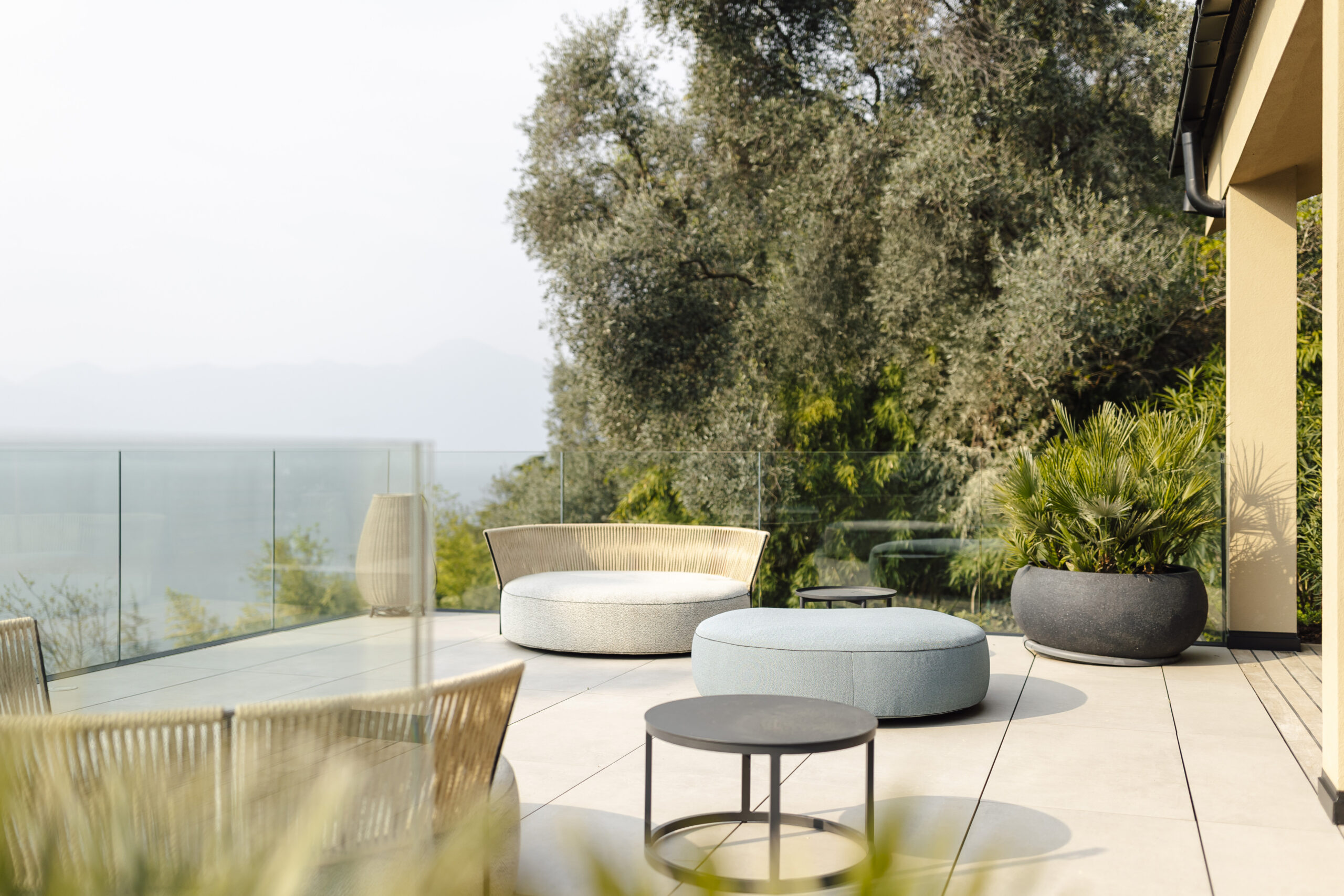Per questo progetto architettonicamente ambizioso sulla sponda orientale del Lago di Garda è stato sviluppato un concetto materico coerente. Gli ambienti abitativi sono stati dotati di un pavimento in rovere oliato nel formato a doghe tipo country, spazzolato artigianalmente e pigmentato per ottenere una tonalità raffinata. Particolare attenzione è stata posta sull’adattamento preciso del pavimento agli infissi a tutta altezza e agli arredi su misura. Per l’esterno sono state posate lastre in gres porcellanato della stessa tonalità, al fine di creare una continuità senza soluzione di continuità tra interno ed esterno.